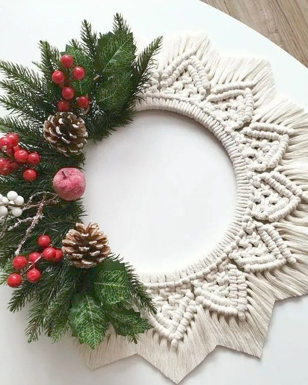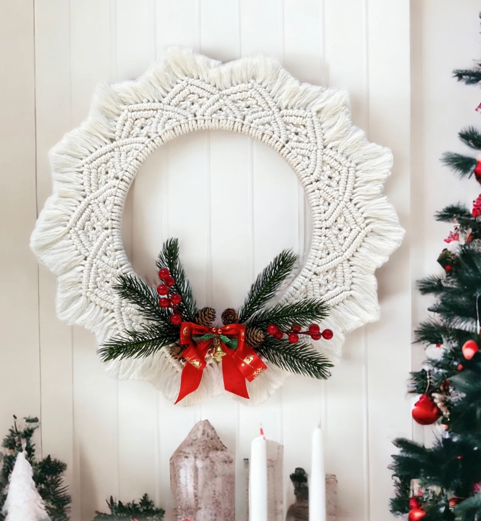 Aprende paso a paso a crear tu corona navideña con la técnica del Macramé y decorarla con ramas navideñas.
