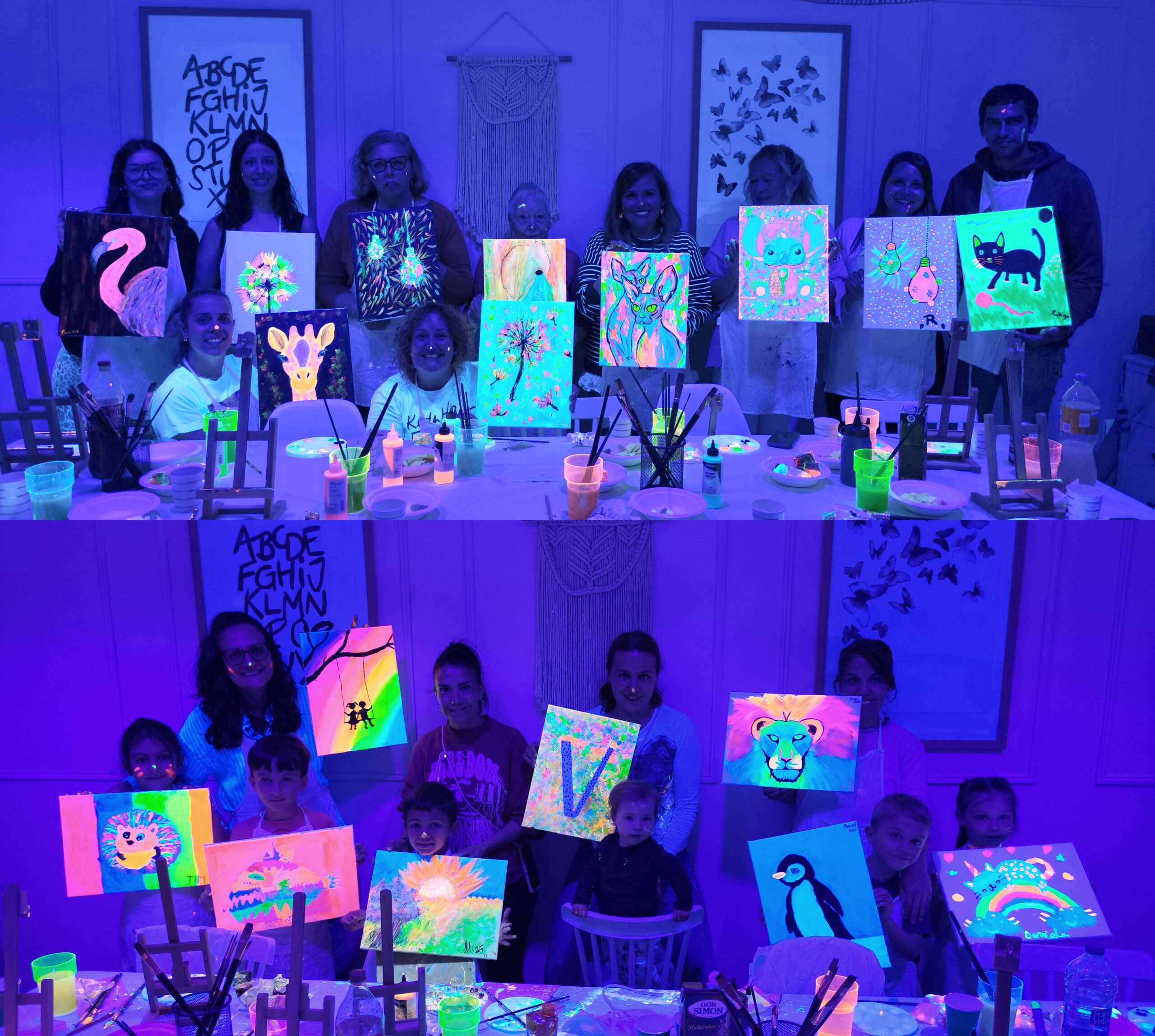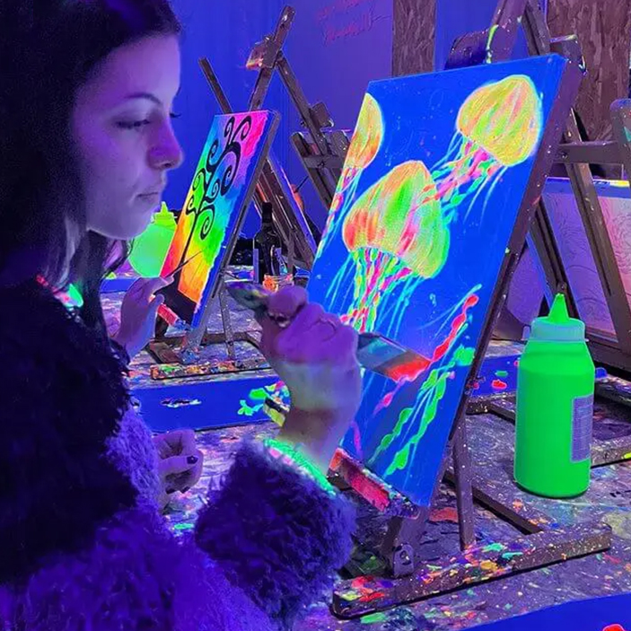 Un taller lleno de color, música y diversión donde, tanto niños como adultos, podrán pintar su propio cuadro con pintura fluorescente en un ambiente original y creativo. ¡Incluye todos los materiales, picoteo, bebida y mucho ritmo!