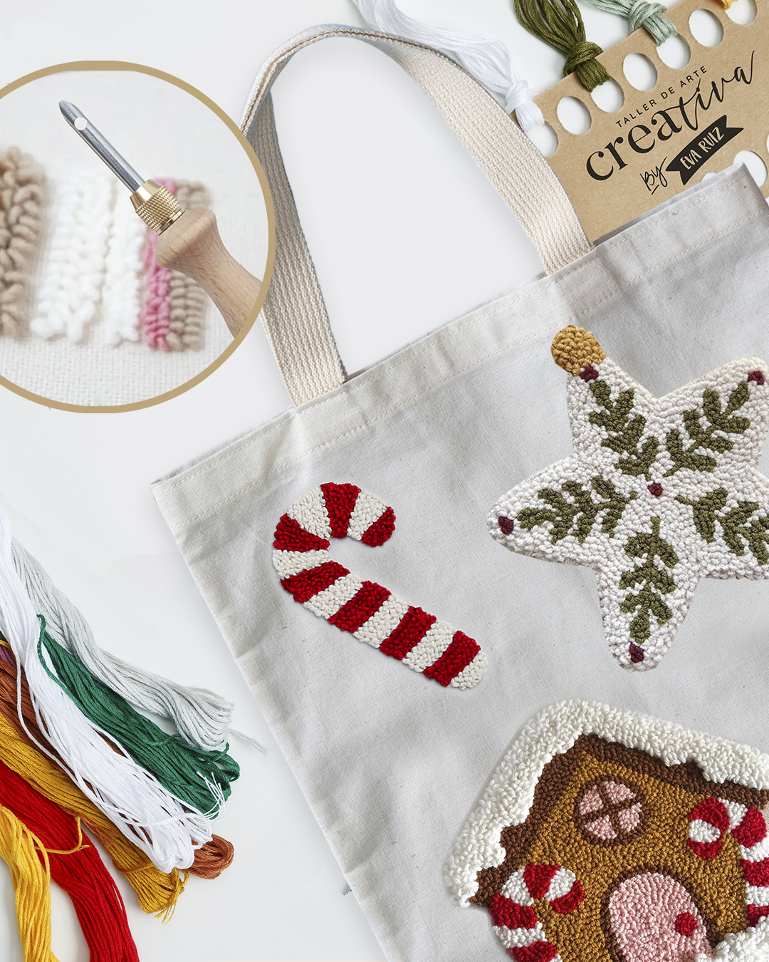 Crea tu totebag navideña 100% personalizada, aprendiendo la técnica del Punch Needle ó aguja mágica (varios diseños a elegir).
